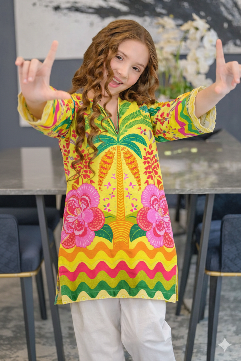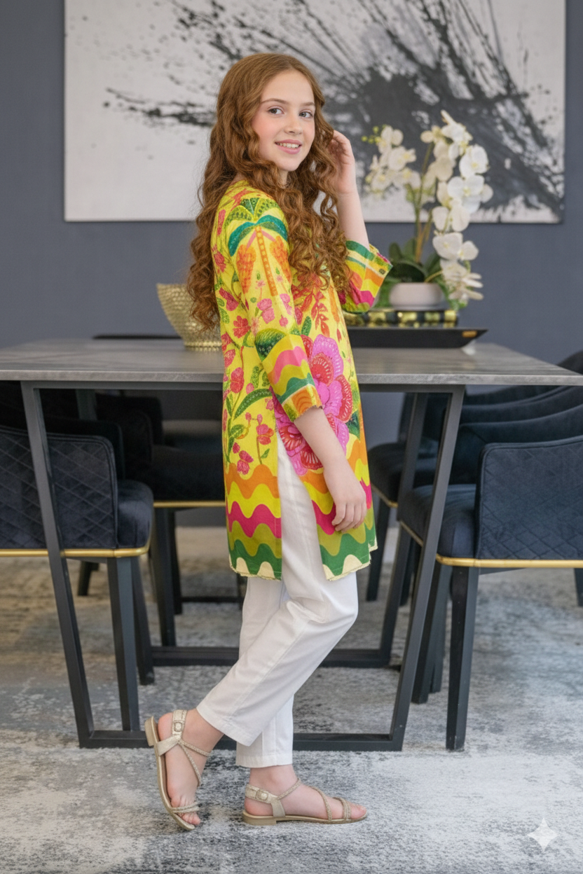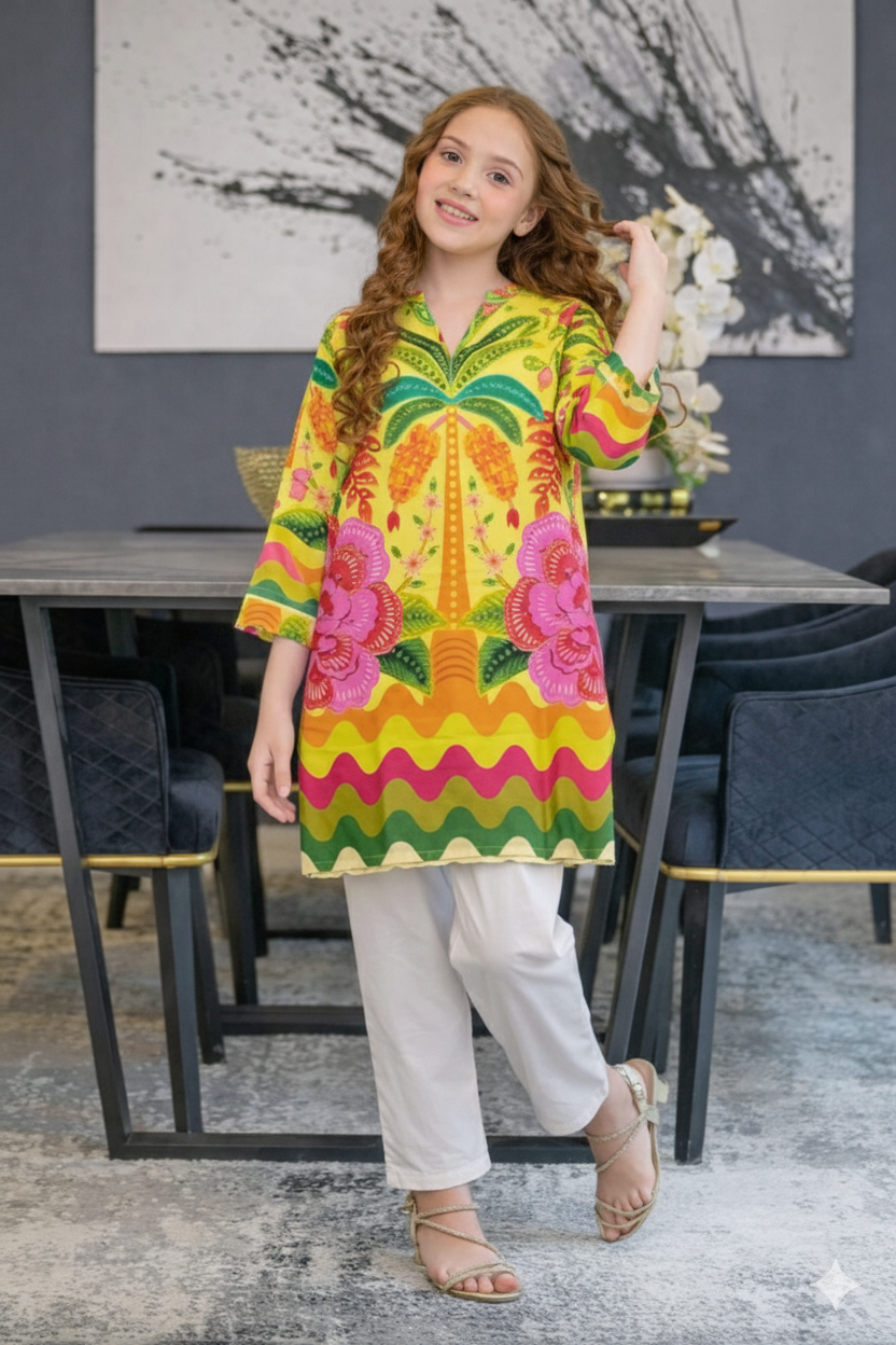 Refresh your summer wardrobe with this charming two-piece poly lawn ensemble. The pristine green tunic features a delightful digital print with vibrant yelllow accents, perfectly complementing the matching plain contrast trousers. Crafted from breathable lawn fabric, this stylish and comfortable outfit is ideal for staying chic in warm weather.