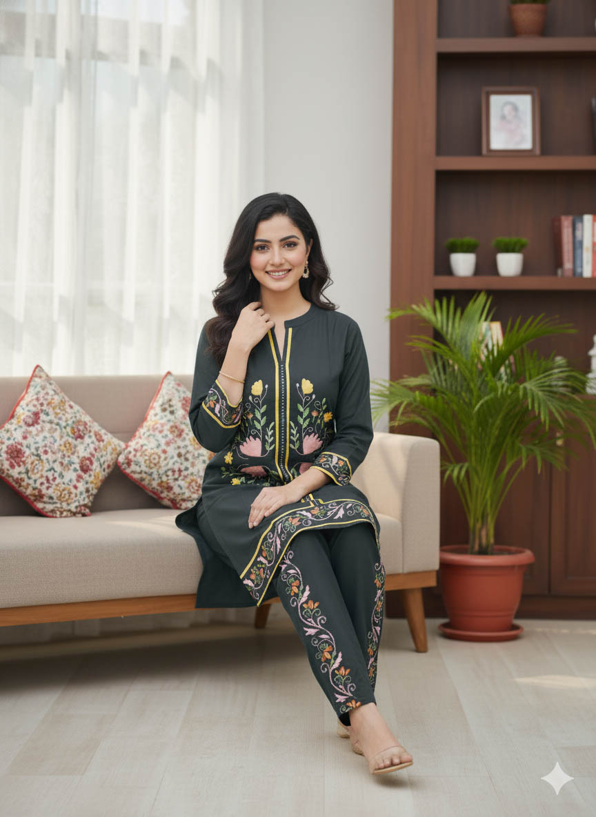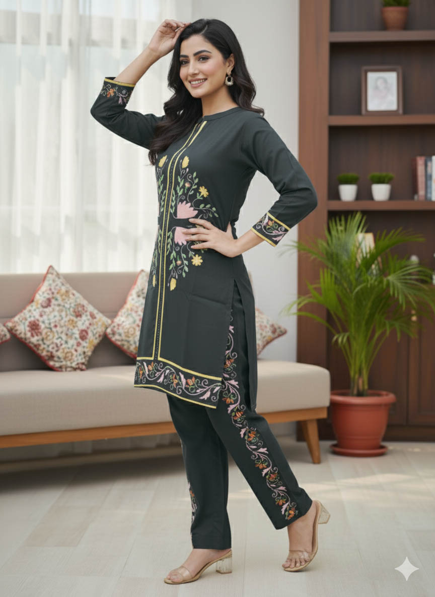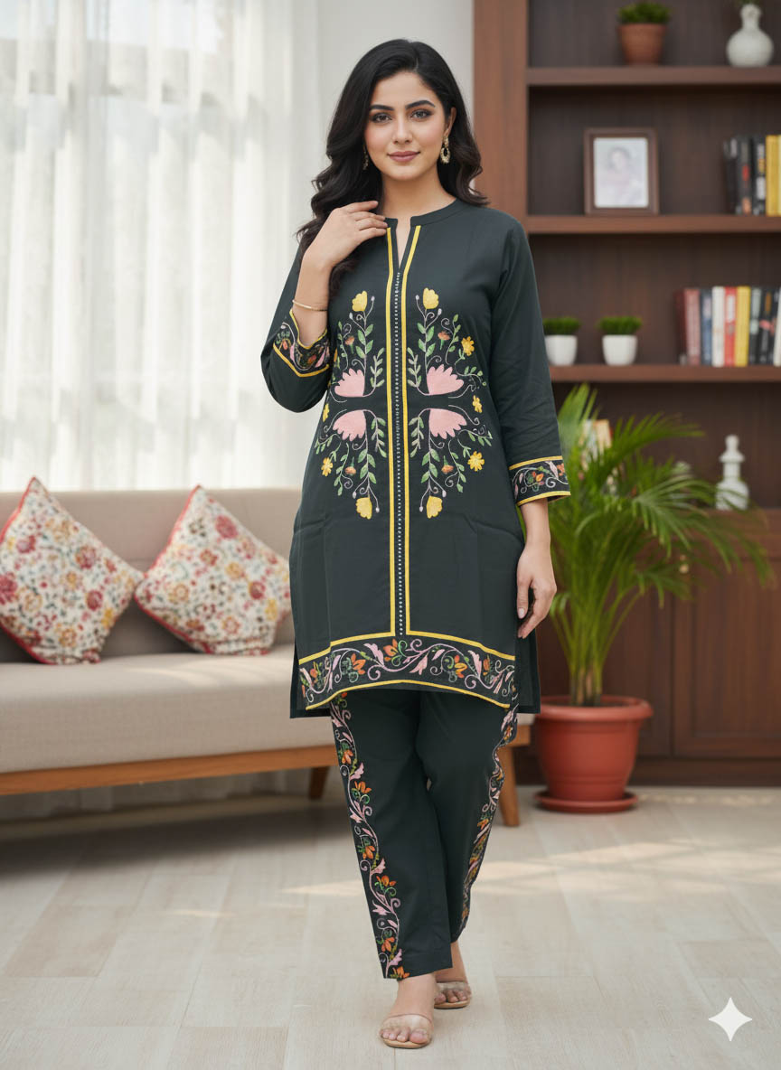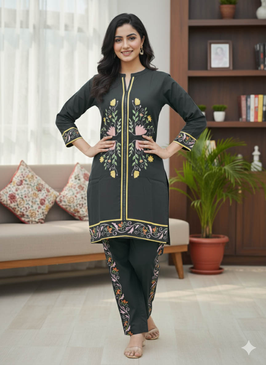 This 2 piece printed-colored features luxurious and comfortable fabric and impeccable cuts given to every detail of the article, offering versatility and sophistication for any occasion.