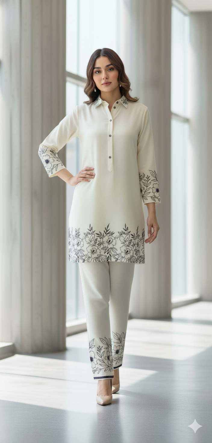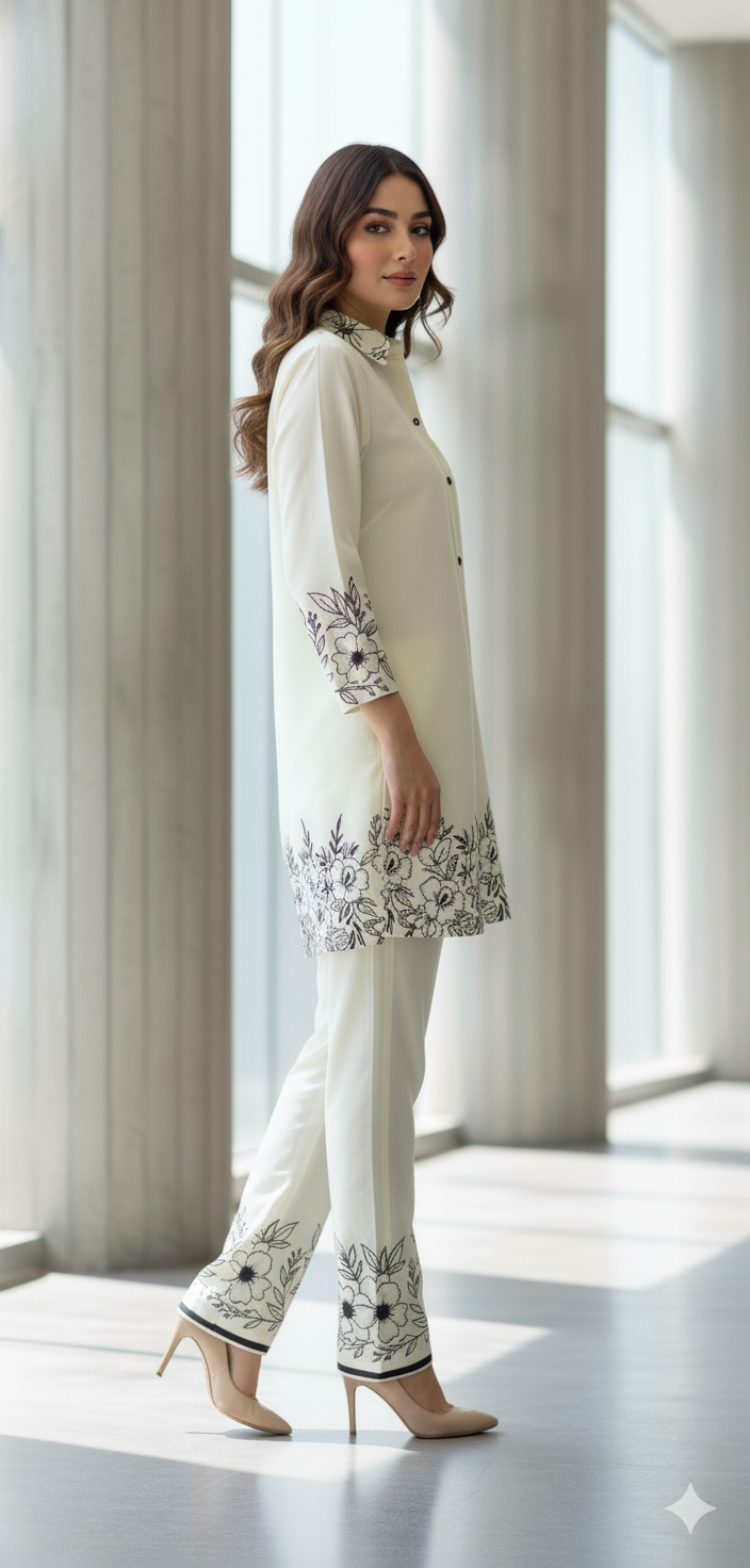 The radiant ensemble offers a unique and stylish look for any special occasion. This 2-piece suit features a chic contemporary short shirt with minimal floral prints. The matching trousers make it a trendy outfit to style at fun gatherings.