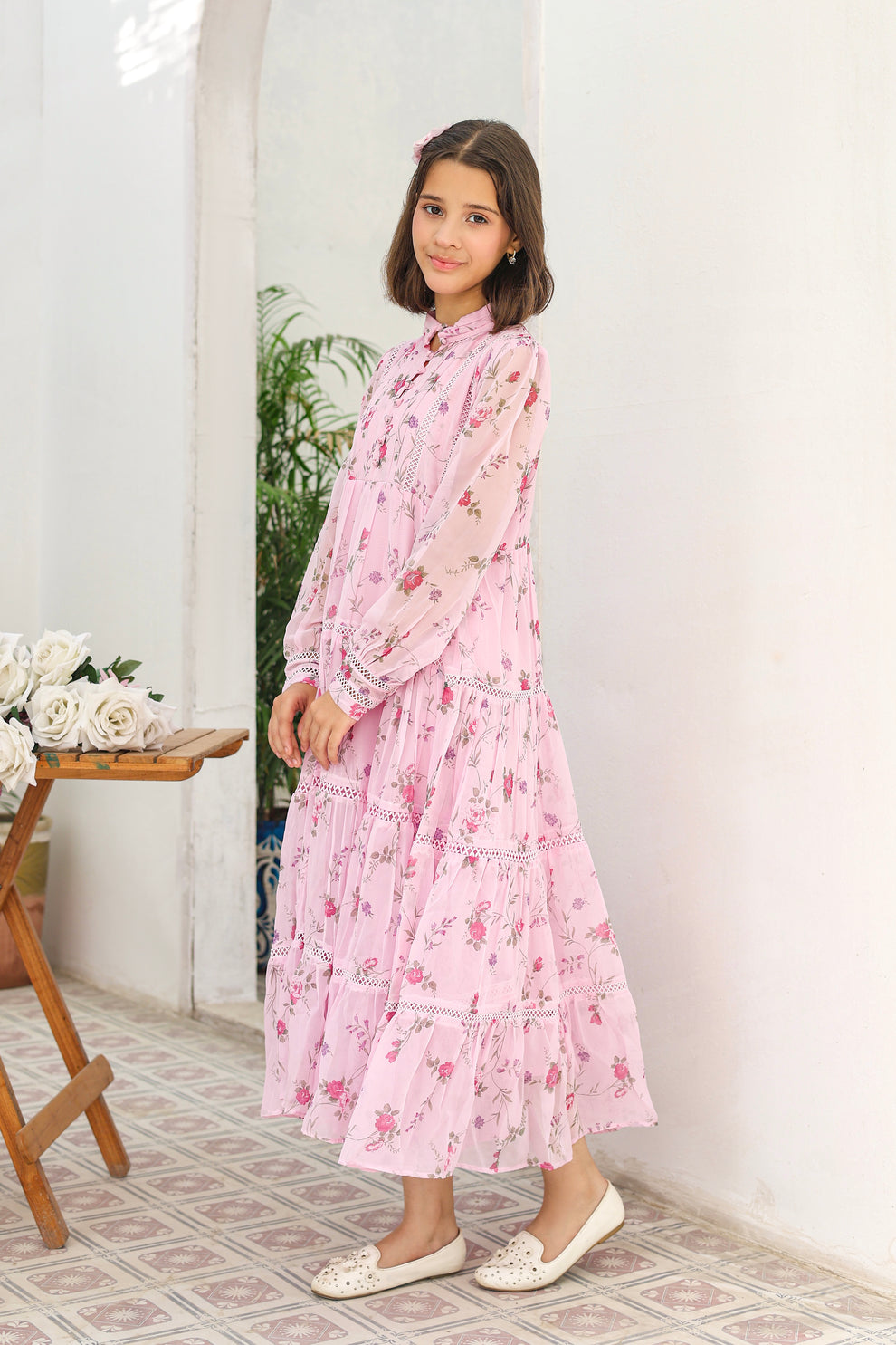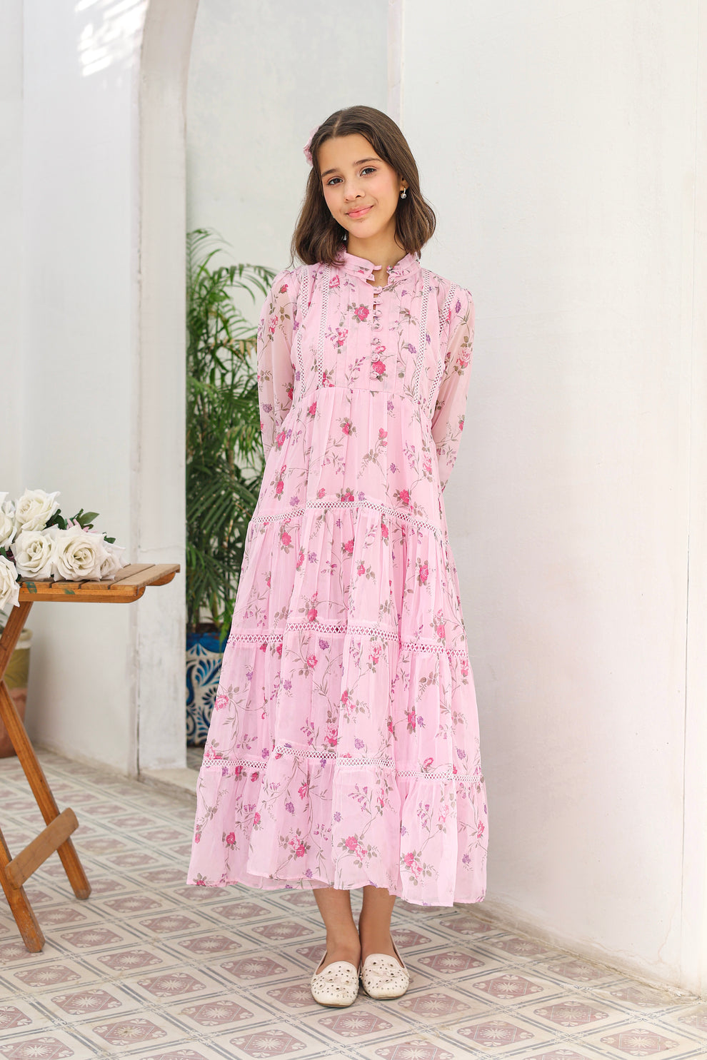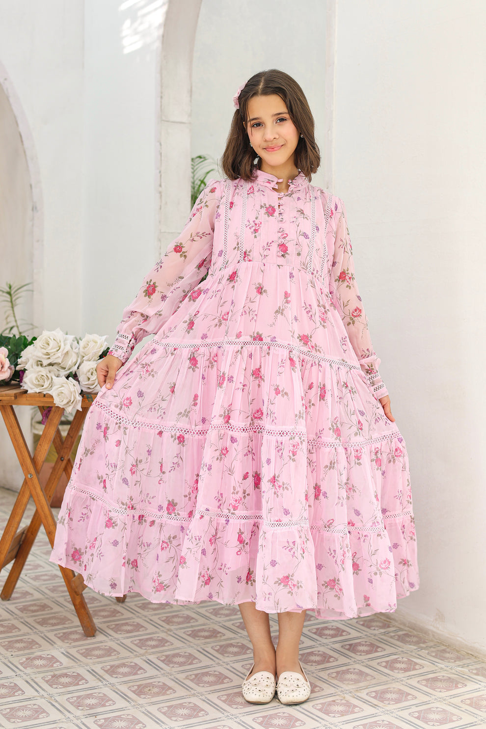 A beautiful frock from Pearls stitch, crafted from flowing chiffon. Featuring elegant collars, cascading laces, and adorable puffy sleeves with lace details, this dress adds charm to any occasion. Perfect for twirling at parties or festive gatherings, Pure Blossom ensures your little one shines with both comfort and style.
