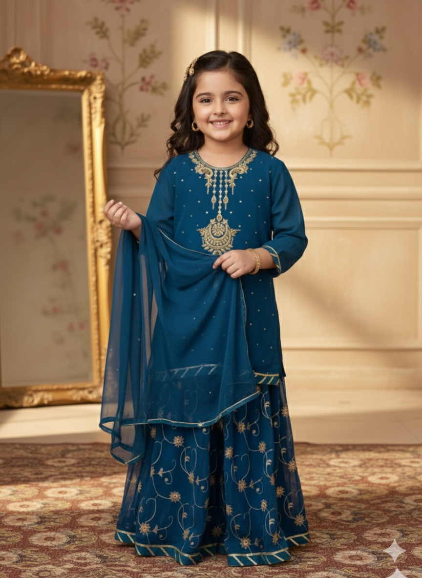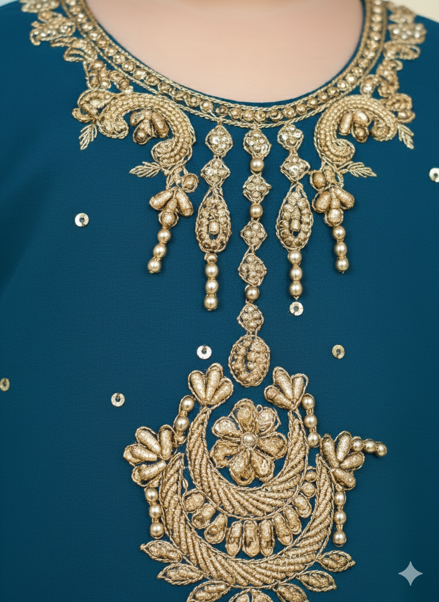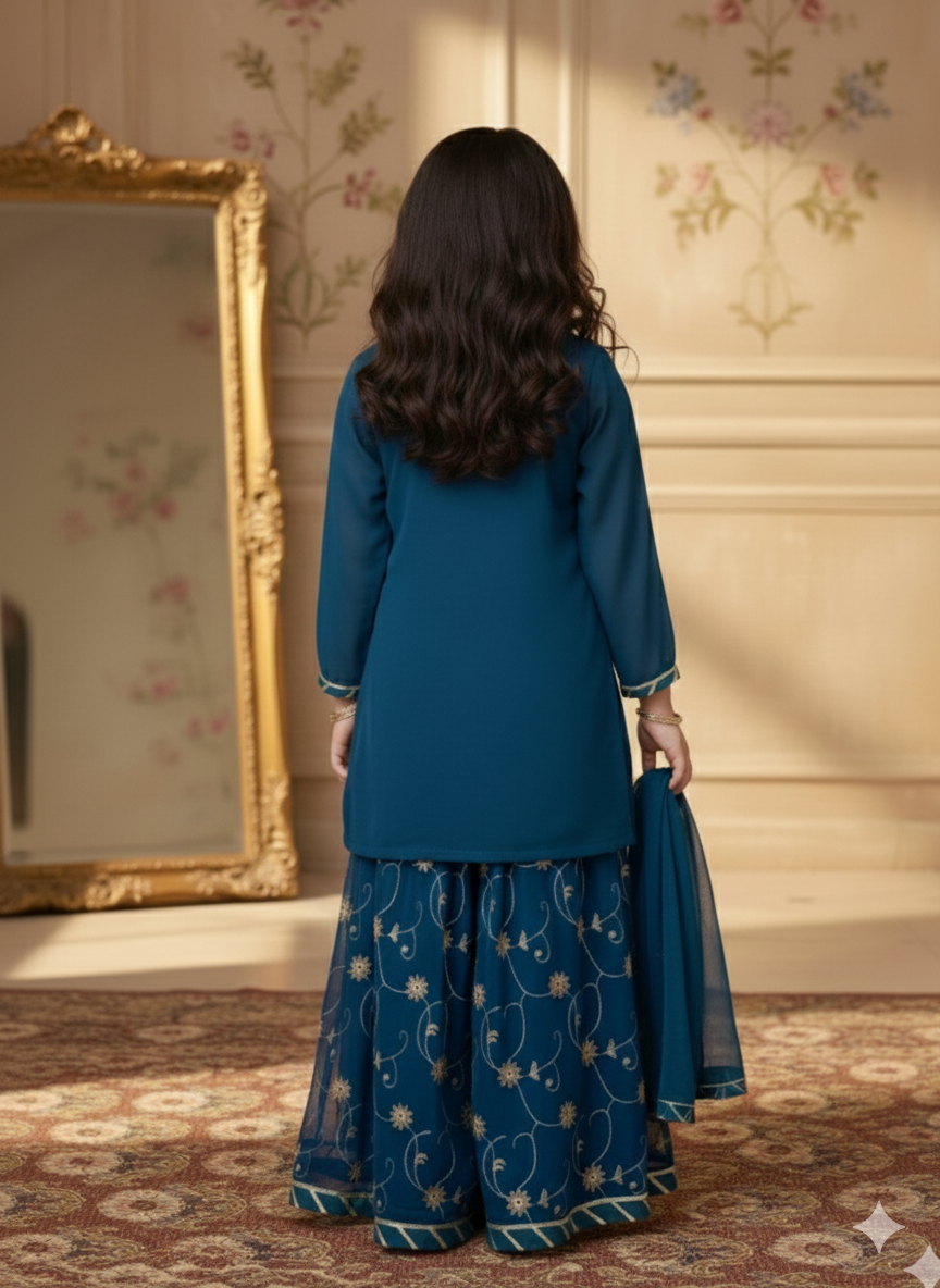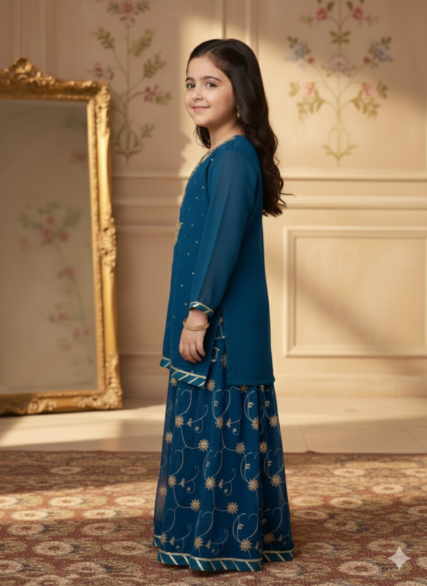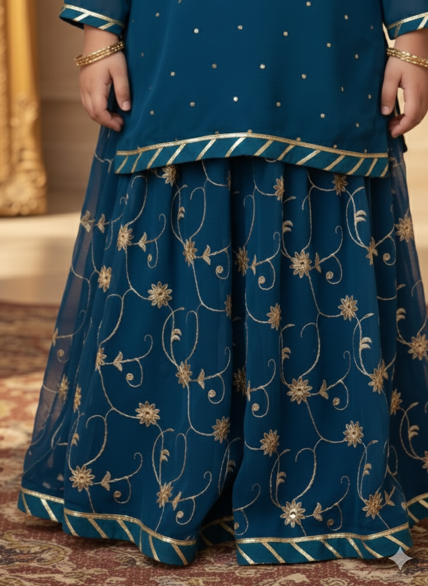 Premium Shiffon adorned with exquisite hand work embroided gharara is a testament to craftsmanship.